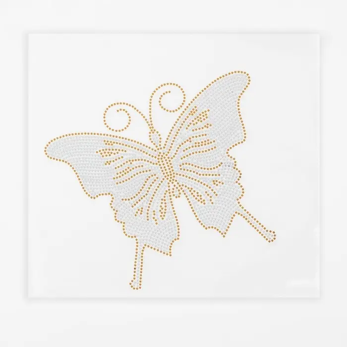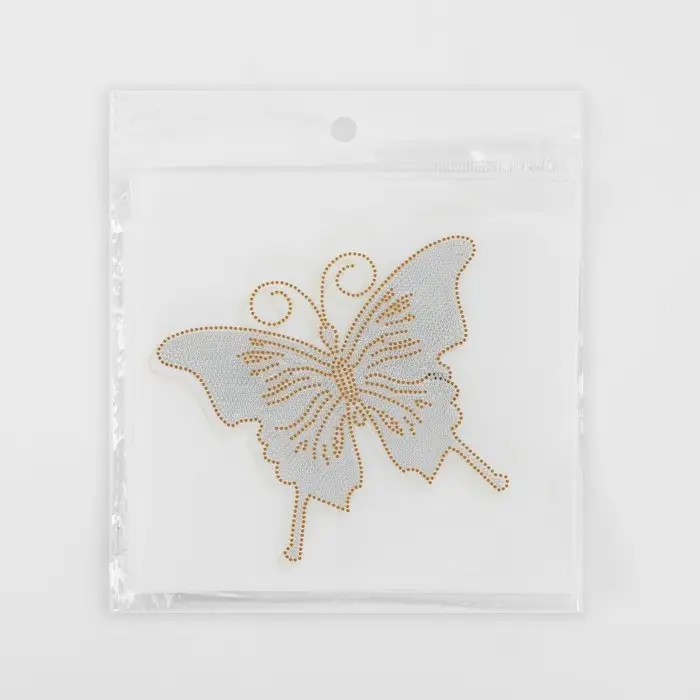 Наклейка украшена пайетками золотого и серебряного цвета, что придаёт ей роскошный и праздничный вид. Благодаря технологии термопереноса она легко фиксируется на ткани, не требуя специальных навыков или оборудования. В упаковке 10 штук, что позволяет воплотить сразу несколько креативных идей. Тематика «бабочки» делает её универсальной для детской и взрослой одежды, а также для различных аксессуаров.