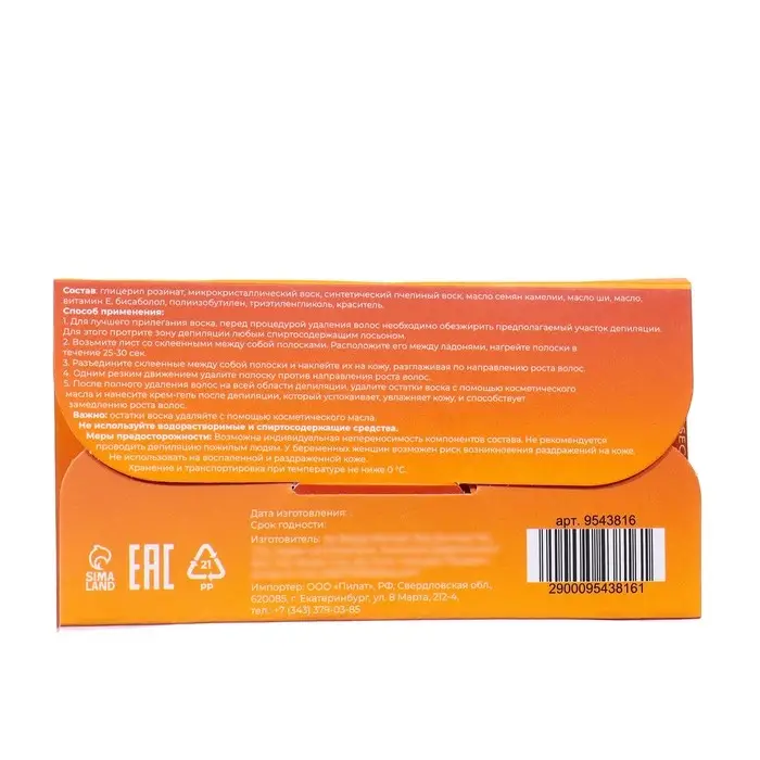Меры предосторожности: Возможна индивидуальная непереносимость компонентов состава. Не рекомендуется проводить депиляцию пожилым людям. У беременных женщин возможен риск возникновения раздражений на коже. Не использовать на воспаленной и раздраженной коже.