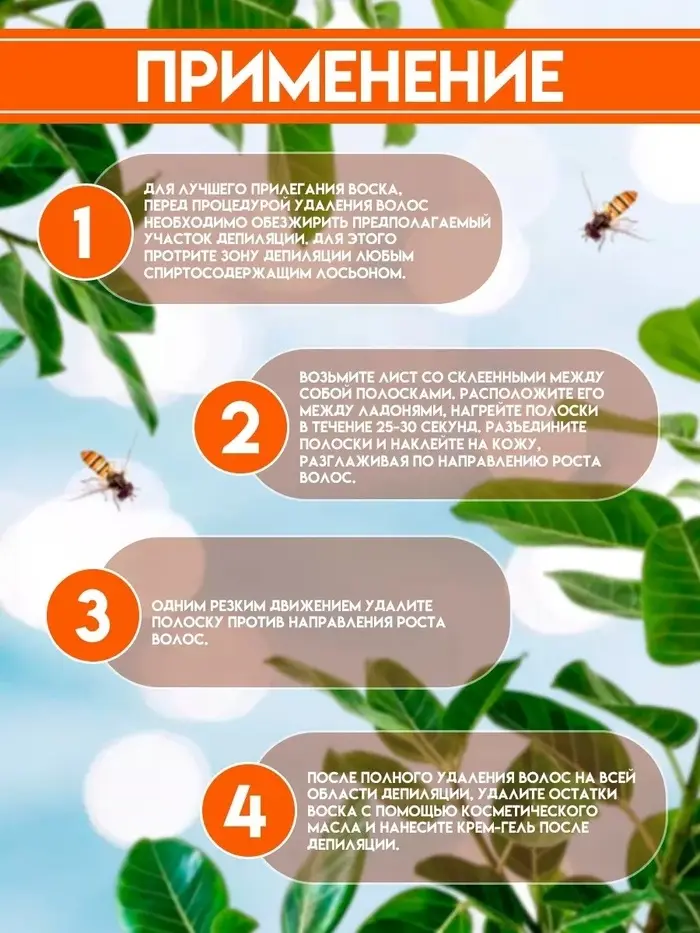 Важно: остатки воска удаляйте с помощью косметического масла. Не используйте водорастворимые и спиртосодержащие средства.