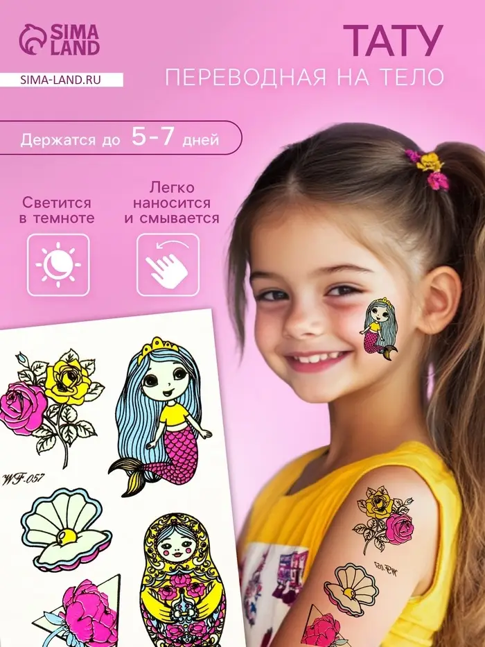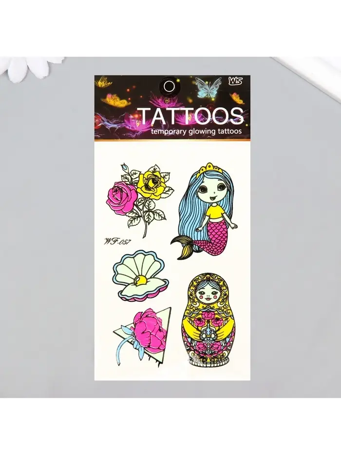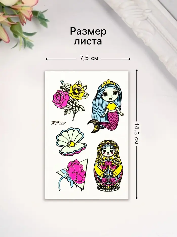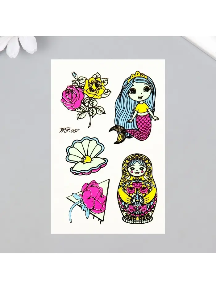 Погрузитесь в волшебный мир ярких образов и сияния! Набор переводных тату «Матрёшка и русалка» — это захватывающий способ выразить свою индивидуальность и добавить яркости вашему образу.