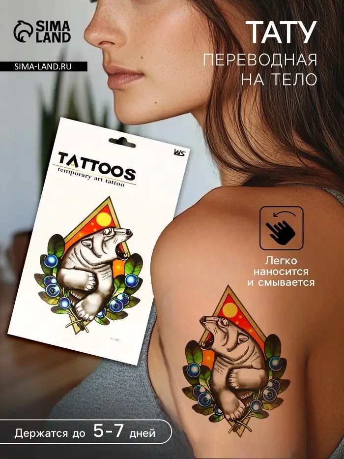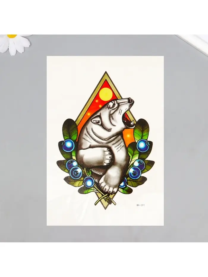 - Яркий и универсальный дизайн: Временные татуировки предлагают разнообразные красочные рисунки, которые идеально вписываются в любой образ. Тематика животного мира с изображением полярного медведя придает ей свежесть и креативность.