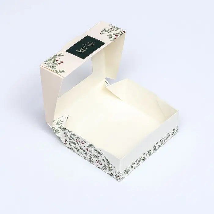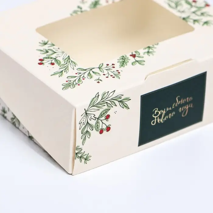 Внутренняя поверхность коробки покрыта тонкой защитной плёнкой, которая эффективно предотвращает раскисание материала. Это гарантирует, что ваши кондитерские изделия останутся свежими и вкусными, как только их упаковали.