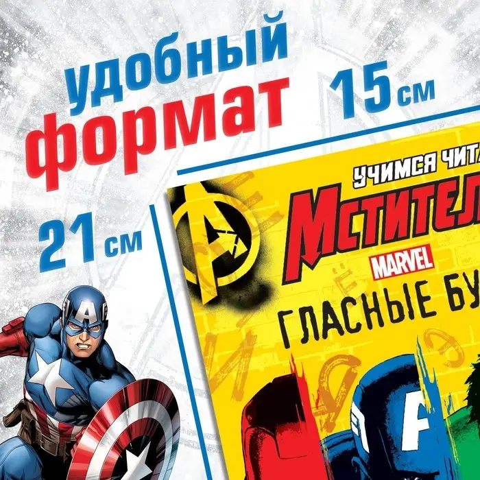 Обучающая книга «Учимся читать. Учим гласные» — это первое пособие для детей от 3 лет, вдохновлённое любимыми героями «Мстителей». Формат А5 и мягкий переплёт делают её удобной для использования дома или в дороге. Этот набор особенно понравится мальчикам, интересующимся супергероями и обучением.