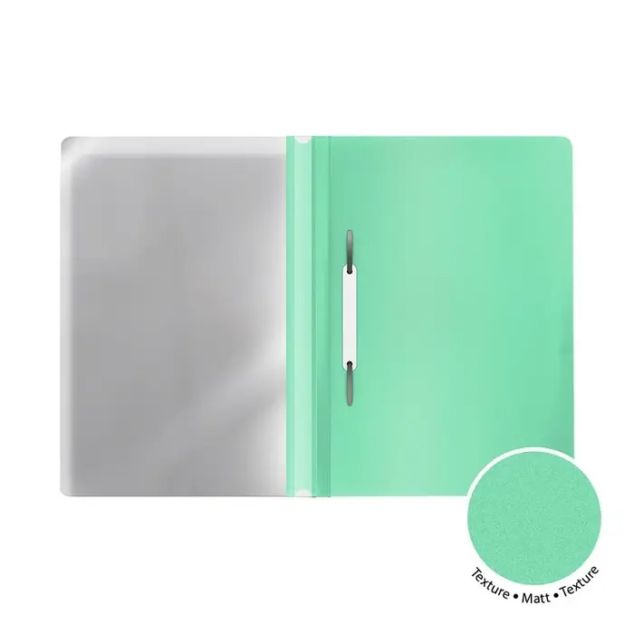 Папка-скоросшиватель формата А4 из высококачественного пластика с текстурой поверхности "песок", на которой не видно отпечатков пальцев и мелких царапин. Предназначена для быстрого сшивания, хранения и просмотра документов. Цвет папки – ассорти: голубой, зеленый, персиковый, фиолетовый. Механизм - механический скоросшиватель; прозрачный верхний лист; усиленный пластиковый корешок с прозрачной полосой для информационной карточки. Папка вмещает до 130 бумажных листов. Размер - 312х230мм, толщина верхнего листа - 0.12мм, толщина нижнего листа - 0.18мм. Код и баркод на каждой единице товара