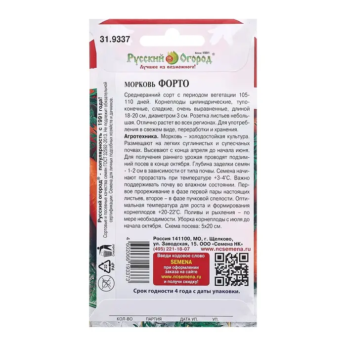 Среднеранний урожайный сорт универсального назначения. Период вегитации 105-110 дней. Корнеплоды выравненные, цилиндрические, с тупым кончиком. Длина 18-20 см, диаметр 3 см. Сердцевина сочная и сладкая! Розетка листьев небольшая. Отлично растёт во всех регионах. Корнеплоды отлично хранятся, подходят для свежих салатов и являются одной из главных составляющих домашнего меню и овощных заготовок.