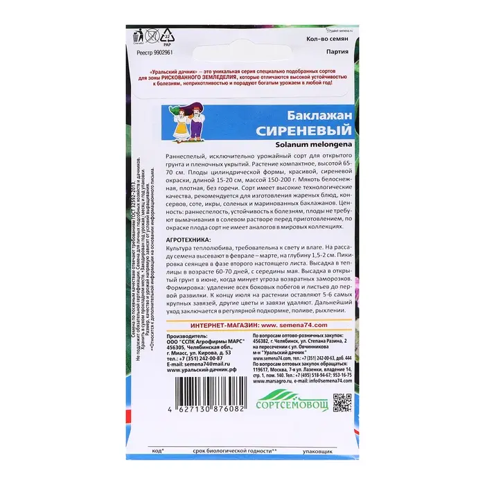 Скороспелый (98-106 дней) сорт для открытого грунта и пленочных укрытий. Растение полуштамбовое, компактное, высотой до 50-60 см. Плоды выравненные, удлиненно-цилиндрические, гладкие, красивой сиреневой окраски, массой 150-250 г. Мякоть белоснежная, плотная, без горечи. Ценность сорта: устойчивость к болезням увядания, обильное и продолжительное плодоношение, оригинальность окраски. Рекомендуется для консервирования, засолки, всех видов кулинарной обработки.