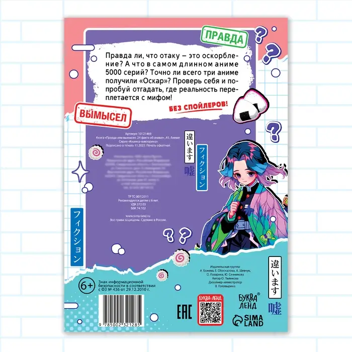 Книга «Правда или вымысел» позволит вам окунуться в культуру аниме. Внутри вы найдёте 20 вопросов и факты о самых культовых аниме. С данной книгой вы сможете не только расширить свой кругозор, но и весело провести время с друзьями, просто устройте увлекательную викторину: задавайте вопрос и собирайте голоса за каждый вариант.