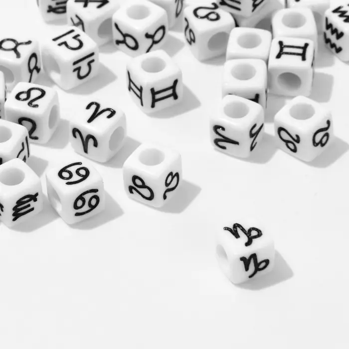 Бусина из акрила «Знаки зодиака» МИКС, кубик 7×7 мм (набор 10 г), цвет бело-чёрный — это оригинальный и стильный элемент для создания уникальных украшений, который добавит загадочности и индивидуальности вашим аксессуарам. Каждый кубик украшен изображениями знаков зодиака, что делает их идеальными для создания персонализированных украшений, таких как браслеты, ожерелья или колье, отражающих астрологические предпочтения владельца.