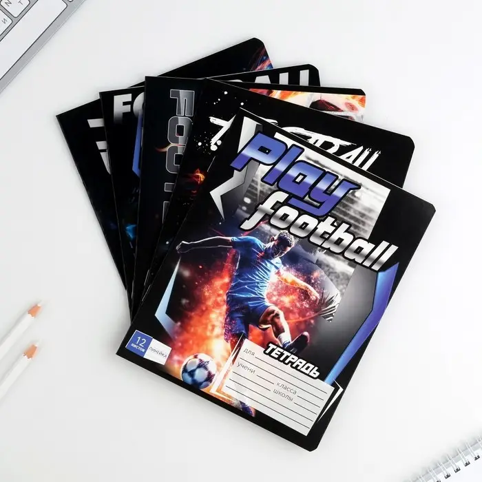 Тетрадь в линейку 12 листов А5, на скрепке «Футбол», обложка мелованный картон, блок №1 белизна 96%, 5 видов МИКС