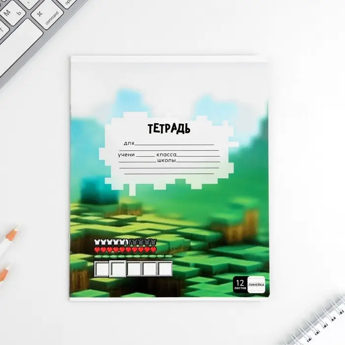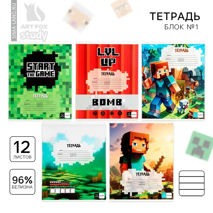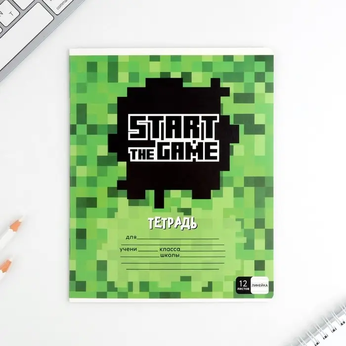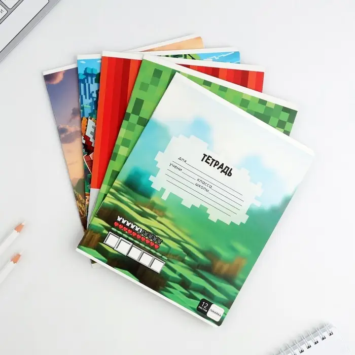 Тетрадь в линейку 12 листов А5, на скрепке «Пиксель», обложка мелованный картон, блок №1 белизна 96%, 5 видов МИКС