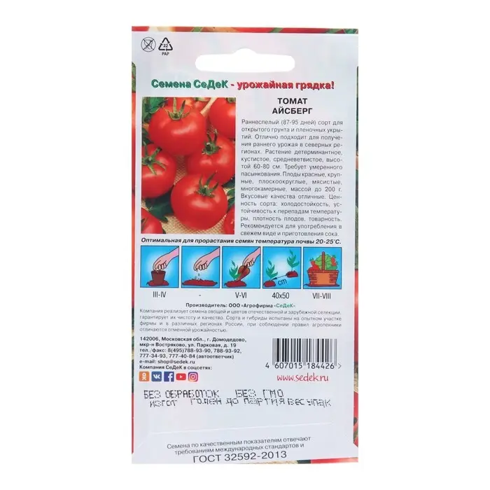 Раннеспелый (87-95 дней) сорт для открытого грунта и пленочных укрытий. Отлично подходит для получения раннего урожая в северных регионах. Растение детерминантное, кустистое, средневетвистое, высотой 60-80 см. Требует умеренного пасынкования. Плоды красные, крупные, плоскоокруглые, мясистые, многокамерные, массой до 200 г. Вкусовые качества отличные. Ценность сорта: холодостойкость, устойчивость к перепадам температуры, плотность плодов, товарность. Рекомендуется для употребления в свежем виде и приготовления сока.