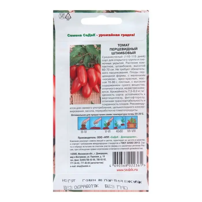 Среднеспелый (110-115 дней) сорт для открытого грунта и пленочных укрытий. Растение компактное, штамбовое, высотой 60-70см. Не требует обязательного пасынкования. Плоды перцевидной формы, с маленьким «носиком», ярко-красные, массой 70-80 г, плотные, с высоким содержанием сухого вещества, отличного вкуса, не растрескиваются. Урожайность 7,5-8,0 кг/м2. Ценность сорта: устойчивость к вертициллезу, фитофторозу, отличная транспортабельность и сохранность плодов. Рекомендуется для свежего употребления, цельноплодного консервирования, засола, переработки на томатопродукты.