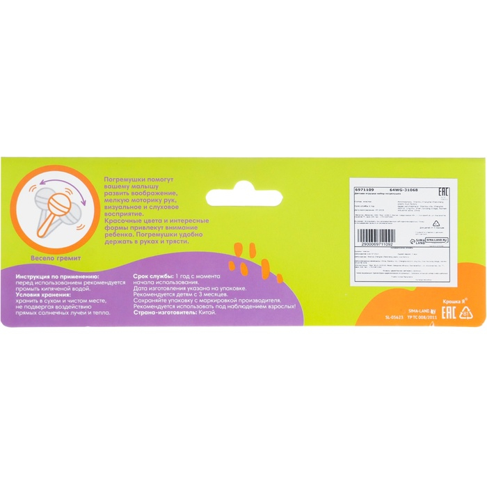 - Легкость и удобство использования: Наши погремушки имеют оптимальный размер и форму для маленьких ручек ребенка. Они легко ухватываются и удобно держатся, позволяя малышу самостоятельно исследовать и играть с ними.