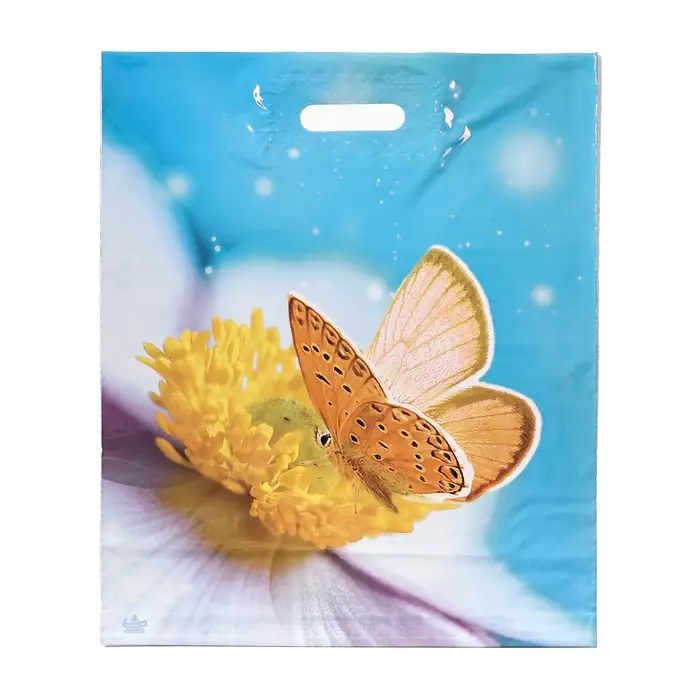 Пакет полиэтиленовый с вырубной ручкой, прочный с оригинальным рисунком.