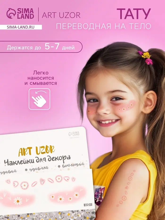 Добавьте нежности своему образу! Цветные веснушки-ромашки — временные татуировки станут оригинальным акцентом в вашем повседневном или праздничном стиле. Эти интересные наклейки на лицо подойдут как для девочек, так и для женщин, которые хотят подчеркнуть свою индивидуальность.