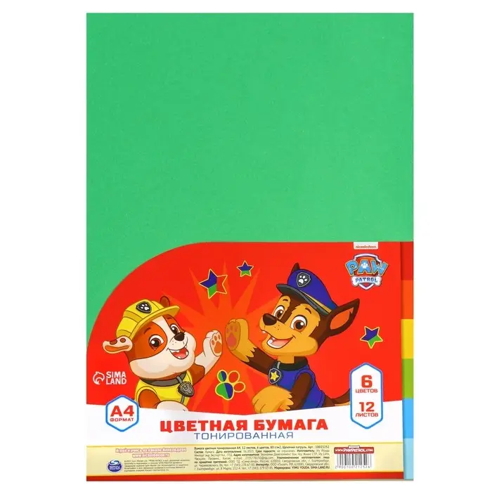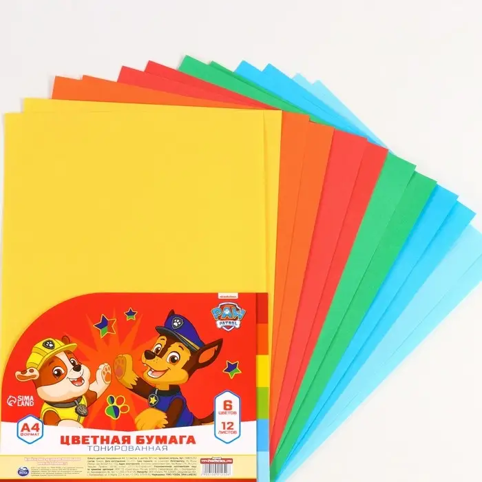 Цветная бумага тонированная, А4, 12 листов, 6 цветов, немелованная, двусторонняя, в пакете, 80 г/м², «Щенячий патруль»