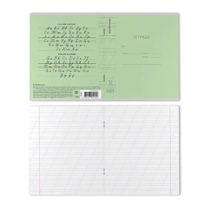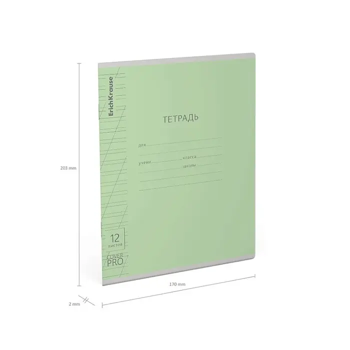 Тетрадь школьная ученическая формата А5+ (170x203 мм). Двойная обложка: внешняя выполнена из высококачественного износостойкого прозрачного пластика с фактурой «апельсиновая корка», внутренняя — из качественной мелованной бумаги. В блоке 12 листов в косую линейку. Бумага офсетная плотностью 60 г/м2. Цвет линовки — синий. Скругленные уголки обложки и блока. Тип скрепления — скоба. Тетради упакованы в термоусадочную пленку по 10 штук.