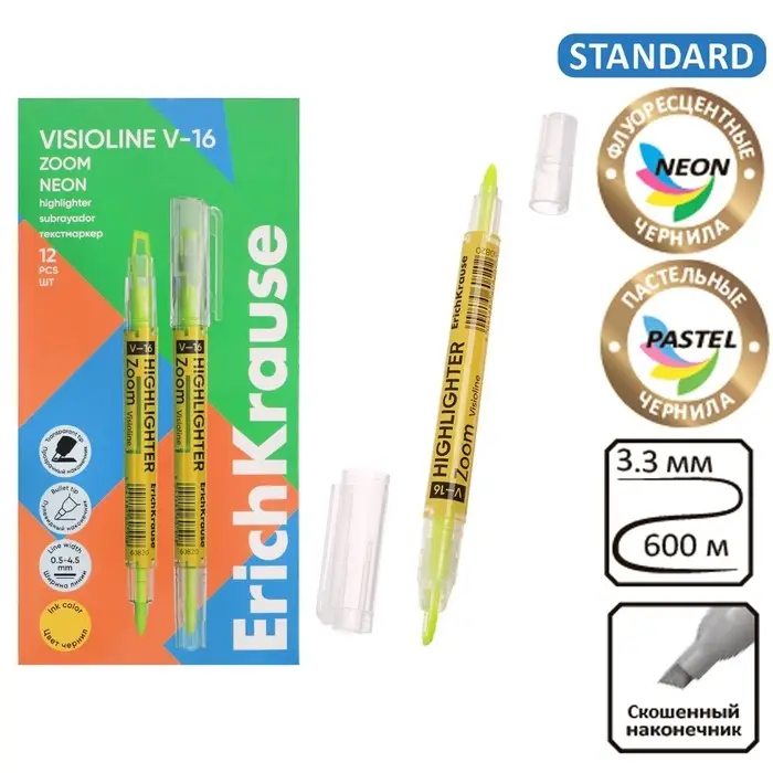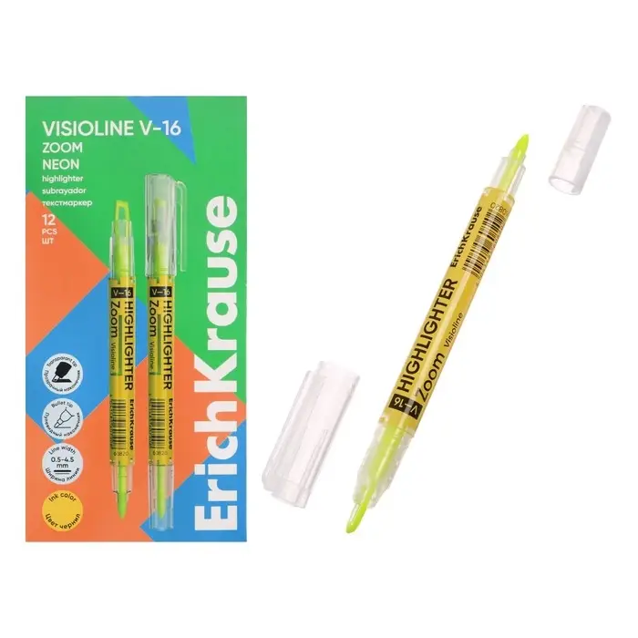 Двухсторонний текстмаркер ErichKrause Visioline V-16 Zoom Neon, цвет чернил желтый (в коробке по 12 шт.)