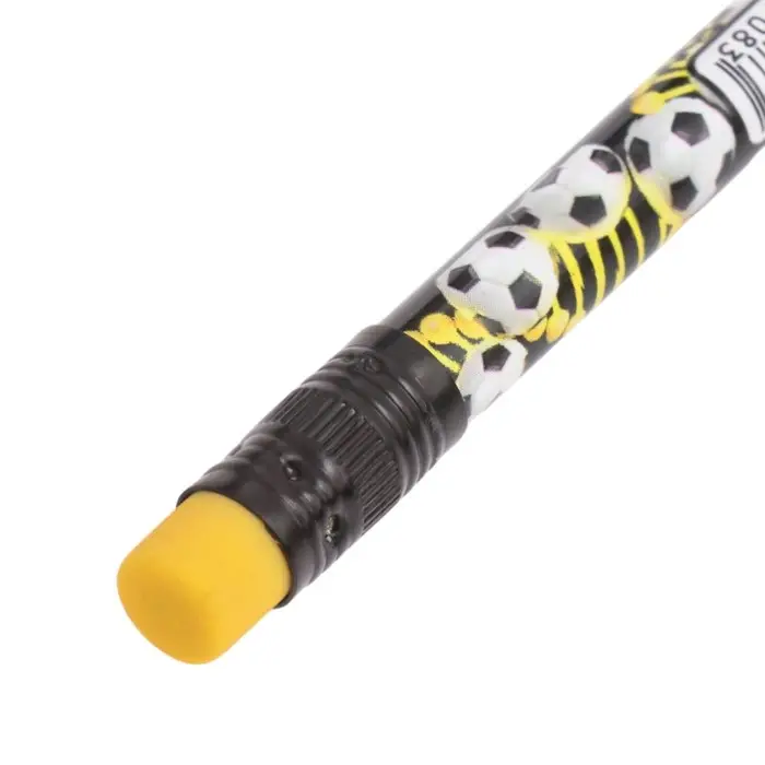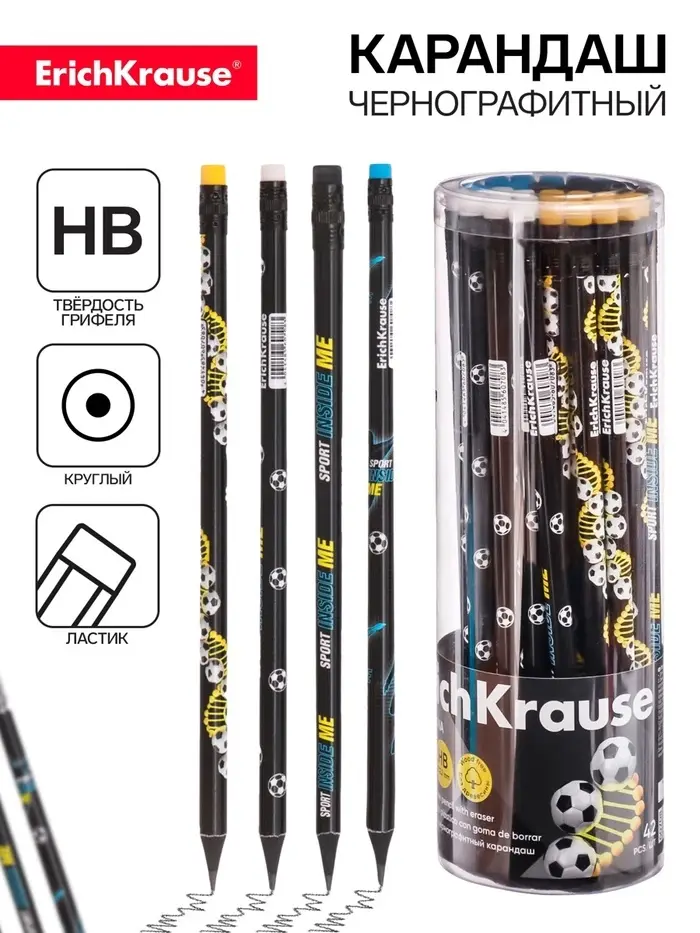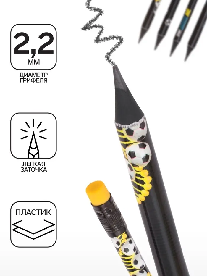Круглый чернографитный карандаш из пластика с ударопрочным грифелем, твёрдость HB. Четыре дизайна корпуса карандаша, ластик черного цвета. Благодаря специальной технологии изготовления карандаша методом экструзии грифель надежно фиксируется к корпусу. Идеальная центровка грифеля гарантирует легкую заточку с экономным расходом карандаша. Грифель диаметром 2.2 мм не царапает бумагу и не крошится при рисовании. Ластик карандаша средней жесткости изготовлен из экологически чистого и гипоаллергенного материала термопластичной резины (TPR). Не содержит ПВХ. Длина 188 мм.