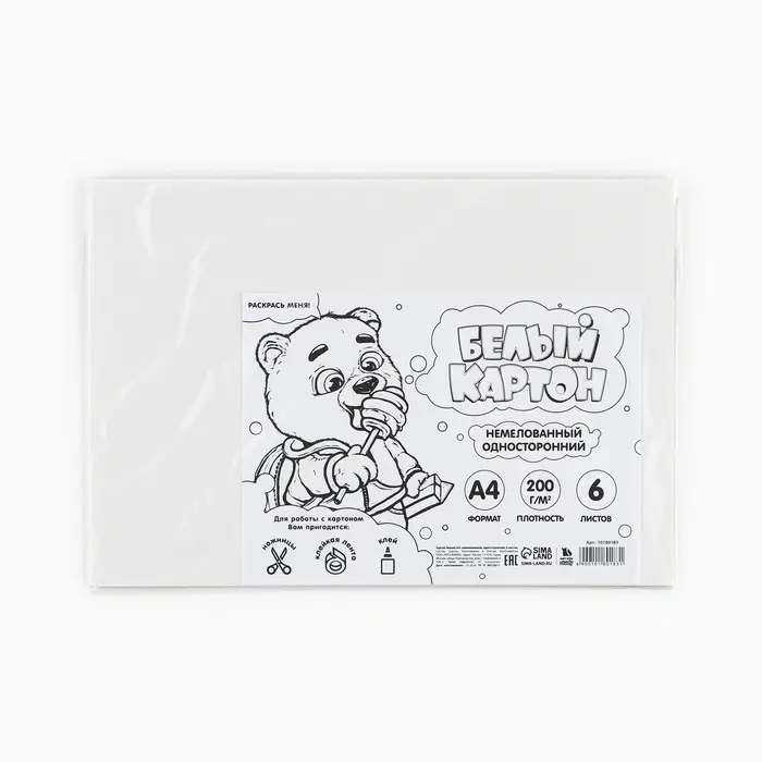 Картон белый А4, 6 листов немелованный односторонний 200 г/м² в пакете