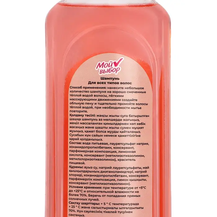 - Шампунь "Мой выбор" подходит для всех типов волос – от нормальных до сухих и поврежденных, обеспечивая им необходимую заботу и восстановление.