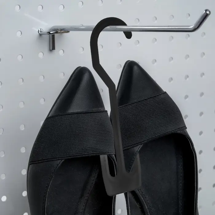 Изготовленная из прочного пластика, вешалка обеспечивает надежное удержание обуви, предотвращая её повреждение и смятие. Черный цвет не только стильно выглядит, но и легко вписывается в любой дизайн, делая вашу обувь более аккуратной и организованной.