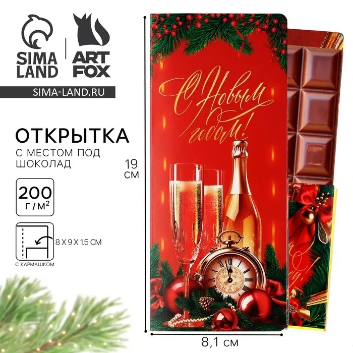 Открытка с местом для шоколадки «Счастья в Новом году! Шампанское с бокалами»