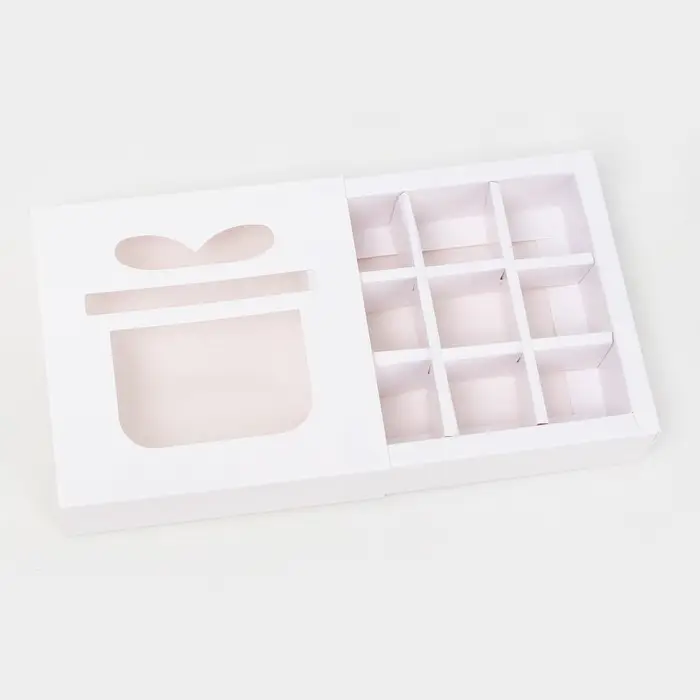 Коробка предназначена для упаковки и транспортировки девяти конфет. Она имеет достаточную вместимость для того, чтобы защитить продукты от повреждений и сохранить их свежесть.
