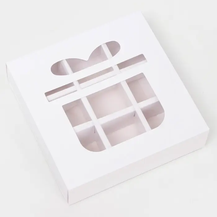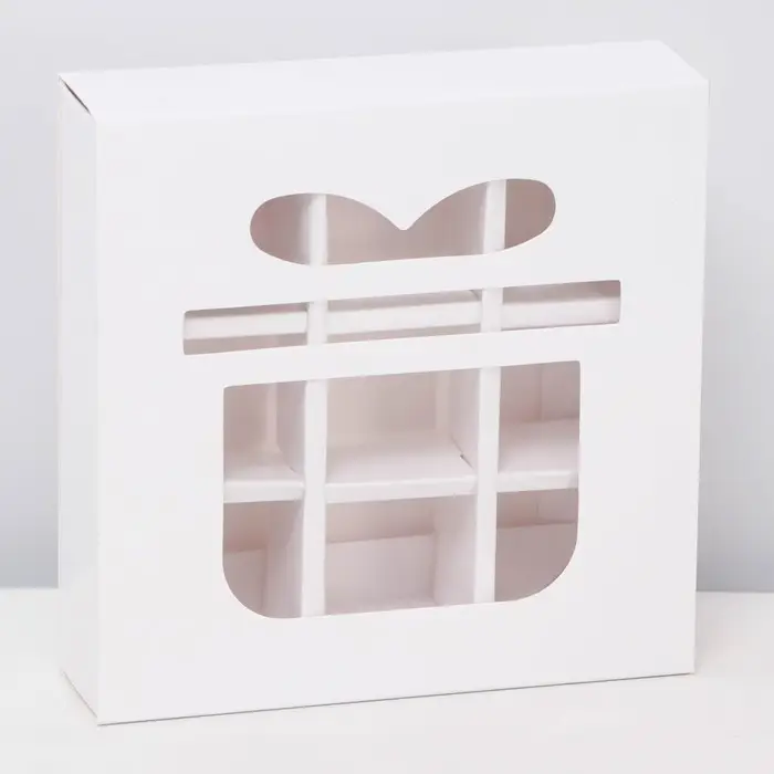 Коробка под 9 конфет вырубка "Подарок" имеет размеры 13,7 см в длину, 13,7 см в ширину и 3,8 см в высоту. Она выполнена из белого картона высокого качества, что обеспечивает прочность и долговечность.