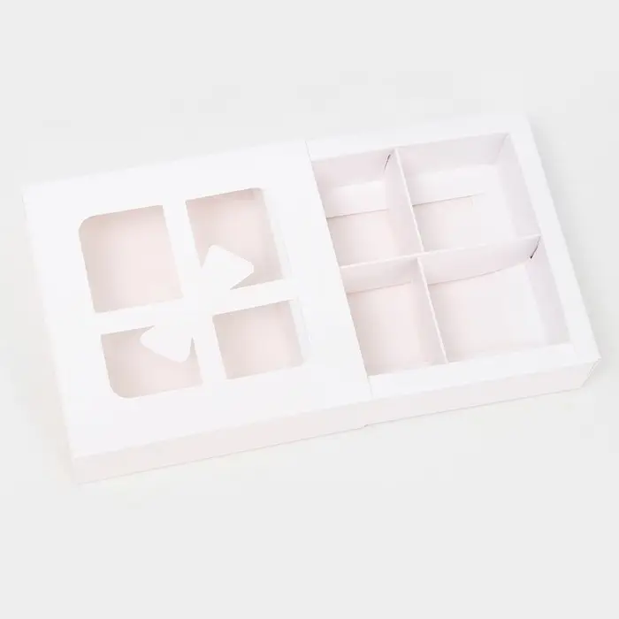 Коробка имеет квадратную форму с вырубкой в виде бантика, что делает ее уникальной и привлекательной для покупателей. Она также может быть использована для создания красивой и привлекательной упаковки для продажи выпечки в магазинах или на мероприятиях.