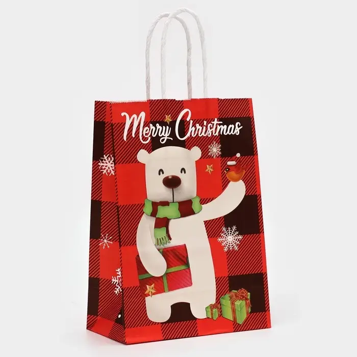 Пакет бумажный подарочный новогодний крафт «Белый Медведь» 15×21×8 см