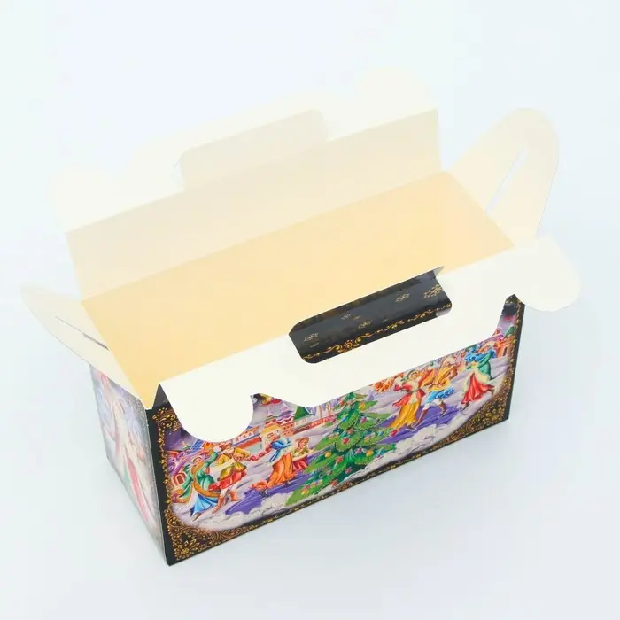 Коробка выполнена из качественных материалов, которые обеспечивают сохранность содержимого. Она имеет яркий и красочный дизайн, который отражает атмосферу Нового года.