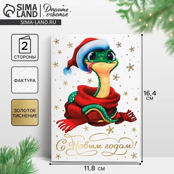 Открытка с новым годом на акварельном картоне «Змея 2025», тиснение, 11.8 х 16.4 см