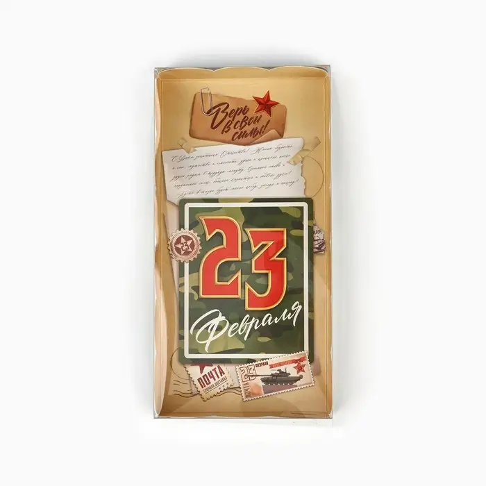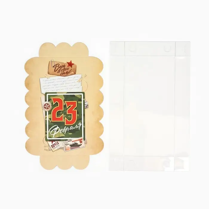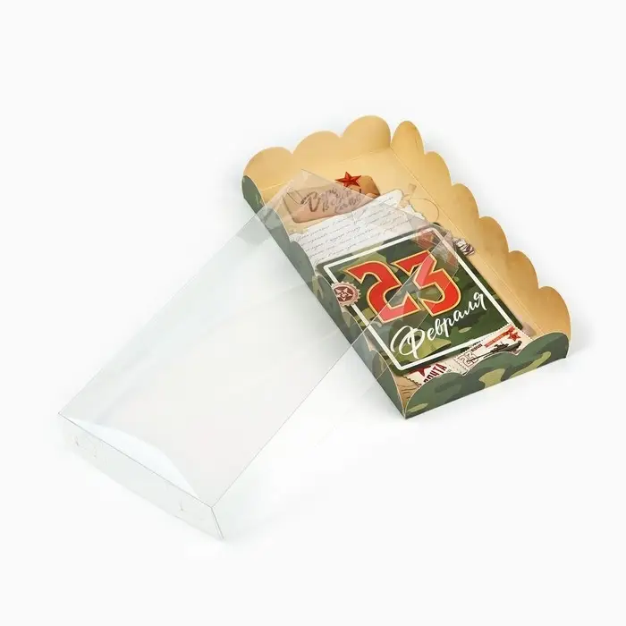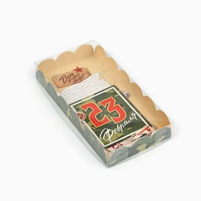 Коробка для кондитерских изделий с пластиковой крышкой «23 Февраля», 10.5 х 21 х 3 см