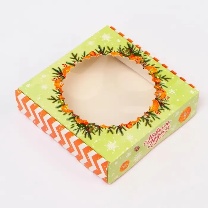 Коробка изготовлена из прочного картона, а прозрачное окно на крышке позволяет эффектно продемонстрировать содержимое, сохраняя его свежесть и целостность. Яркий новогодний дизайн, включающий снежинки, елочные украшения и рождественские элементы, создаёт атмосферу праздника и волшебства.