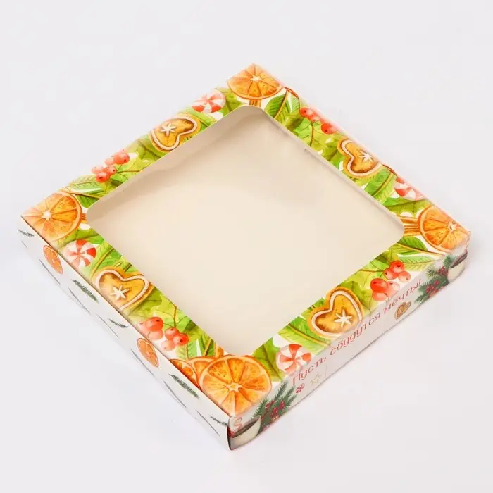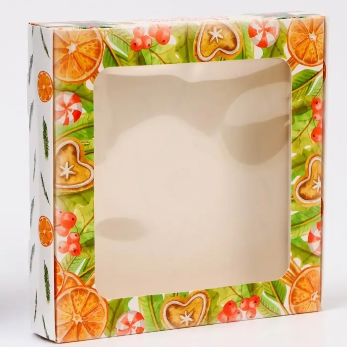 Коробка изготовлена из прочного картона, а прозрачное окно на крышке позволяет эффектно продемонстрировать содержимое, сохраняя его свежесть и целостность. Яркий новогодний дизайн, включающий снежинки, елочные украшения и рождественские элементы, создаёт атмосферу праздника и волшебства.