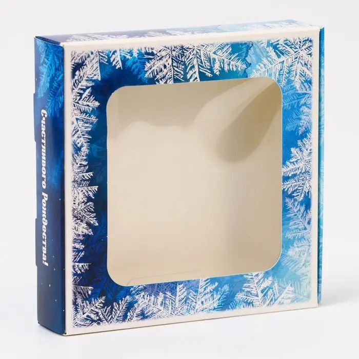 Коробка изготовлена из прочного картона, а прозрачное окно на крышке позволяет эффектно продемонстрировать содержимое, сохраняя его свежесть и целостность. Яркий новогодний дизайн, включающий снежинки, елочные украшения и рождественские элементы, создаёт атмосферу праздника и волшебства.
