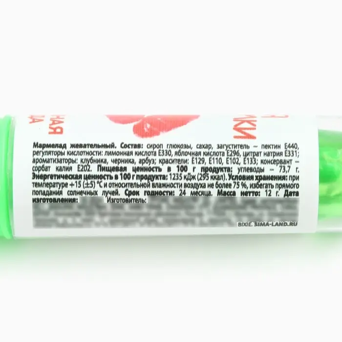 Состав: сироп глюкозы, сахар, загуститель - лектин Е440, регуляторы кислотности: лимонная кислота Е330, яблочная кислота Е296, цитрат натрия Е331; ароматизаторы: клубника, черника, арбуз; красители: Е129, Е110, Е102, Е133; консервант - сорбат калия Е202.