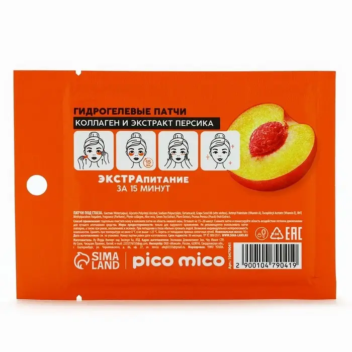 Патчи для области вокруг глаз Very juicy peach, 1 пара, гидрогелевые с коллагеном и экстрактом персика, PICO MICO