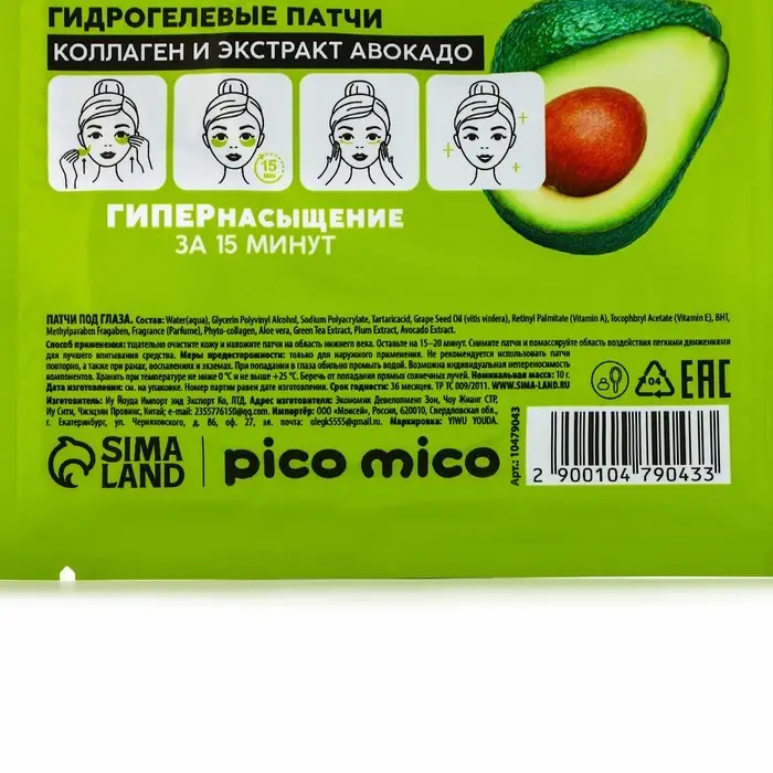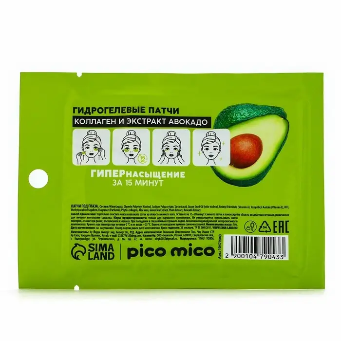 Патчи для области вокруг глаз Green avokado, 1 пара, гидрогелевые с коллагеном и экстрактом авокадо, PICO MICO