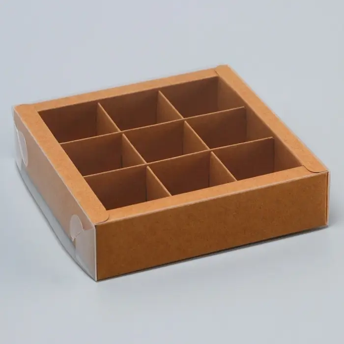 - Внутри коробки предусмотрены 9 ячеек для аккуратного размещения конфет, что обеспечивает их сохранность и презентабельный вид.
