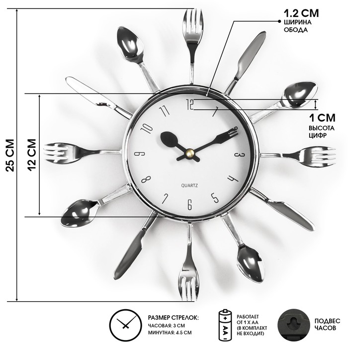 Часы настенные, для кухни, "Вилки, ложки, поварешки", бесшумные, 25 х 25 см, циферблат d-11 см 83107