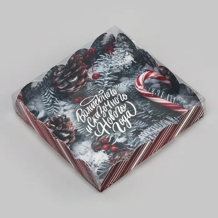 Стильная коробка с ярким зимним дизайном и прозрачной ПВХ крышкой подходит не только для печенья, но и для других десертов: пирожных, пряников или шоколадных конфет.