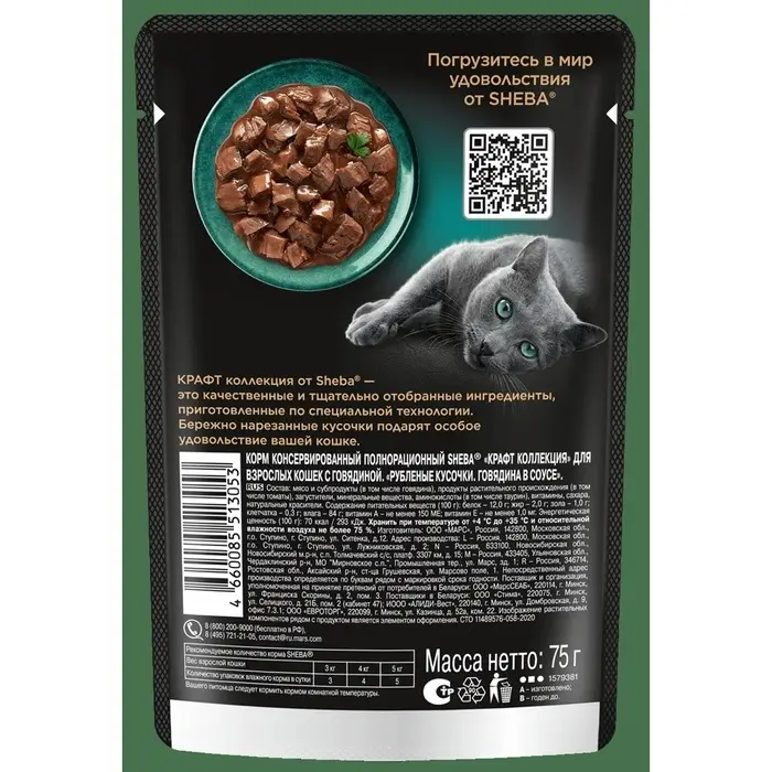 Влажный корм Sheba для кошек с говядиной, паштет в желе, пауч 75 г