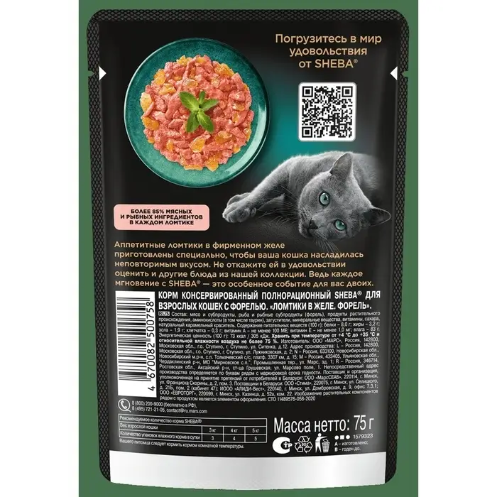 Влажный корм Sheba для взрослых кошек, форель, в желе, пауч, 75г
