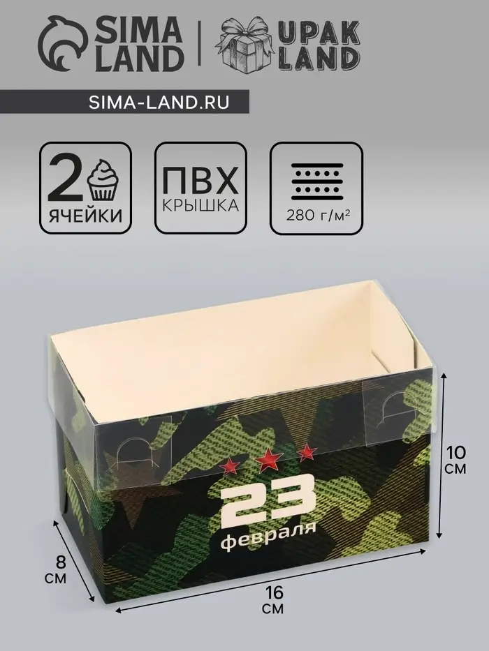 Коробка для капкейка, кондитерская упаковка, 2 ячейки, «23 февраля», 16 х 8 х 10 см