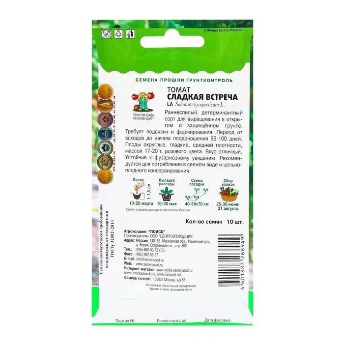 Томатные семена «Сладкая встреча» станут отличным выбором для садоводов, стремящихся вырастить вкусные и сочные плоды. Эти семена специального сорта обладают длительным агрономическим сроком годности в 4 года, что позволяет хранить их для посадки в удобное время.