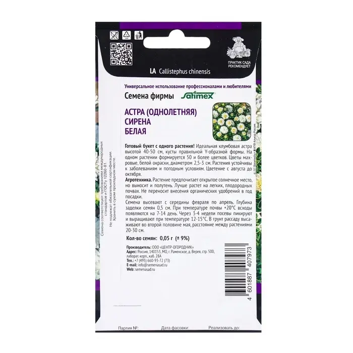 Семена «Белой Сирены» — отличный выбор для тех, кто стремится создать яркие и зажигательные клумбы или разнообразить свой цветочный сад. Эти астры привлекают внимание своей белоснежной махровостью и среднерослым кустом, который станет настоящей жемчужиной вашего сада.