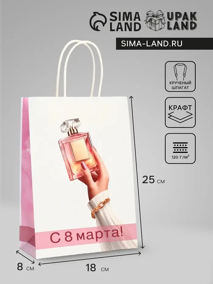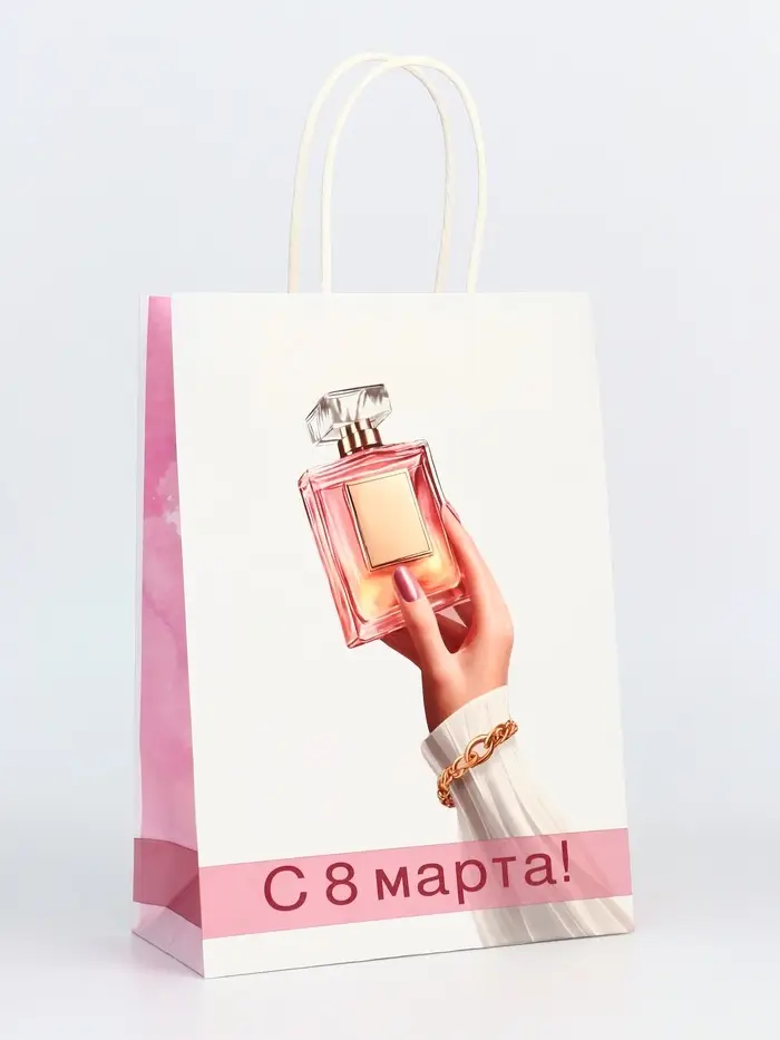 Этот пакет крафт на 8 Марта создан специально для того, чтобы сделать ваш подарок девушке ещё более особенным. Плотность бумаги 120 г/м² гарантирует прочность и надёжность пакета, позволяя безопасно переносить даже хрупкие и ценные вещи.