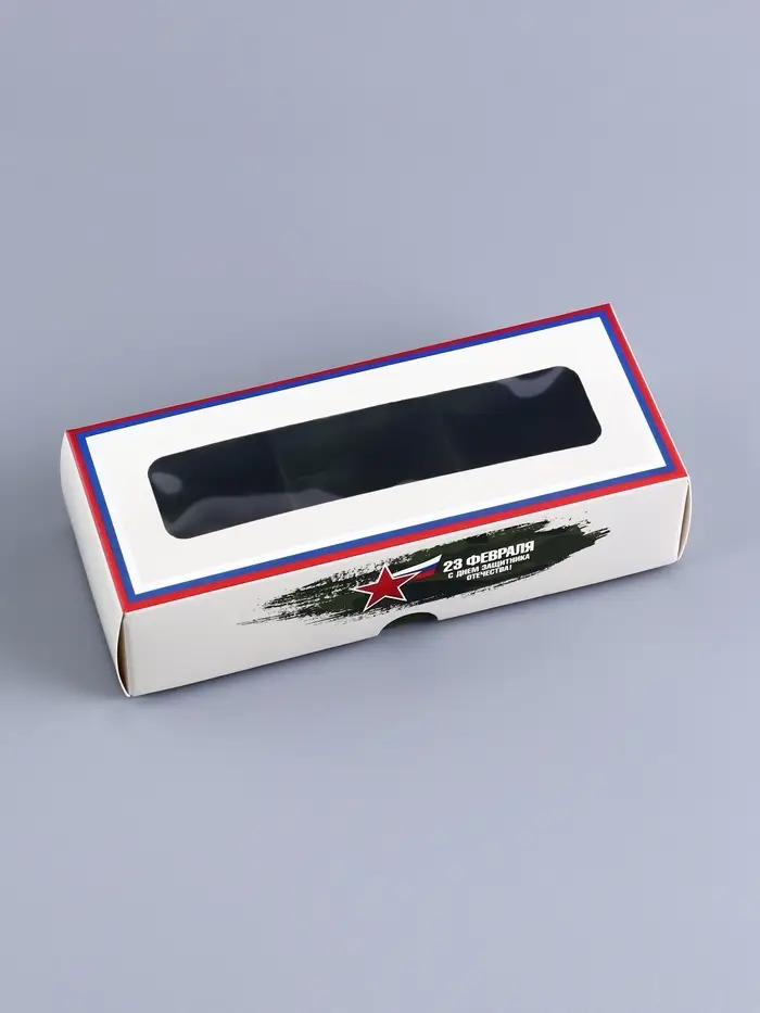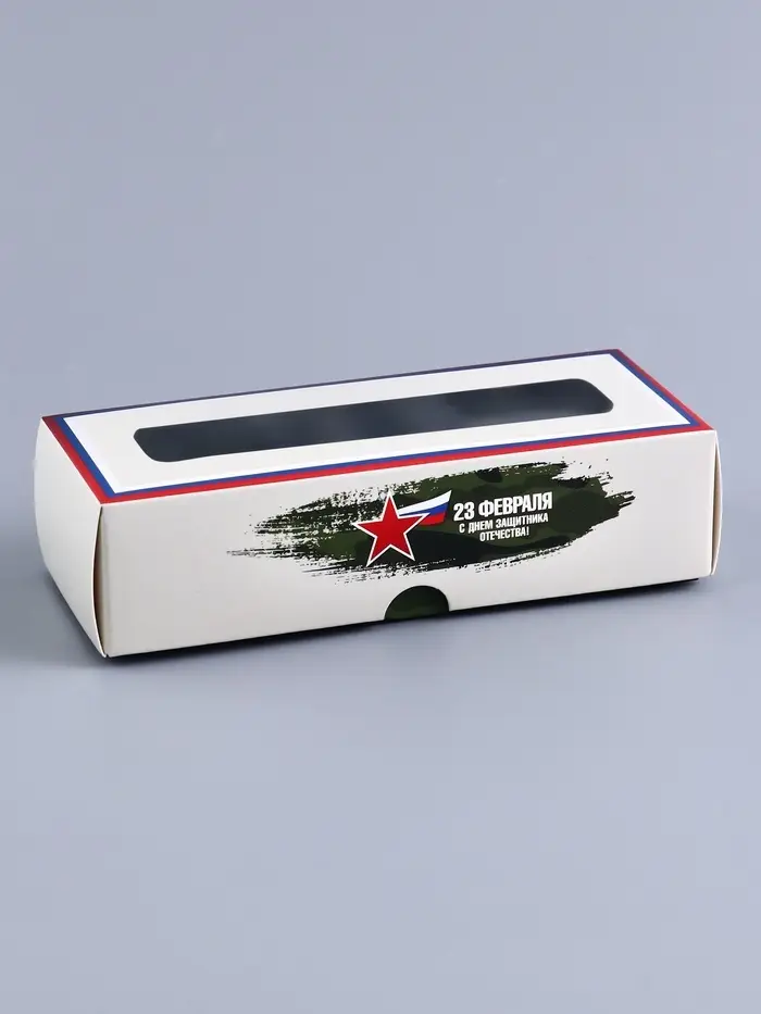 - Оформление коробки посвящено Дню защитника Отечества, с соответствующим дизайном и надписью "23 Февраля".